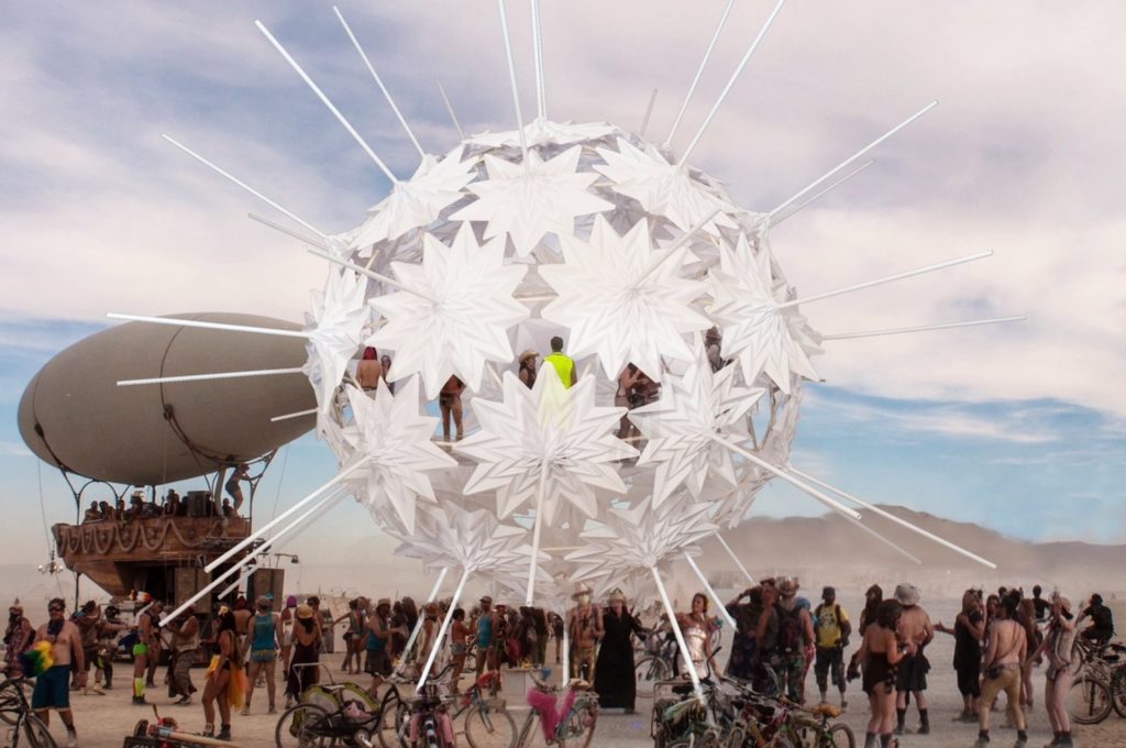 Avevamo lavorato per turni di 16 ore per installare il nostro pezzo d’arte, una serie di 10 fiori origami giganti, incurvati e meccanici. È stata la nostra prima grande installazione a Burning Man e ci è voluto molto più tempo di quanto ci aspettassimo. Dopo giorni, i fiori non funzionavano ancora. Poi è arrivato un temporale torrenziale. Non appena la pioggia si è fermata, siamo saliti sulle nostre biciclette per esaminare il danno. Abbiamo visto i fiori all’orizzonte: gocciolanti e tristi. Poi, improvvisamente, hanno iniziato a illuminarsi, uno dopo l’altro, aprendosi, sbocciando. Ad oggi non sappiamo ancora come siamo riusciti a dar loro vita. Ma quello scenario era esattamente ciò che avevamo immaginato. Anche meglio.
