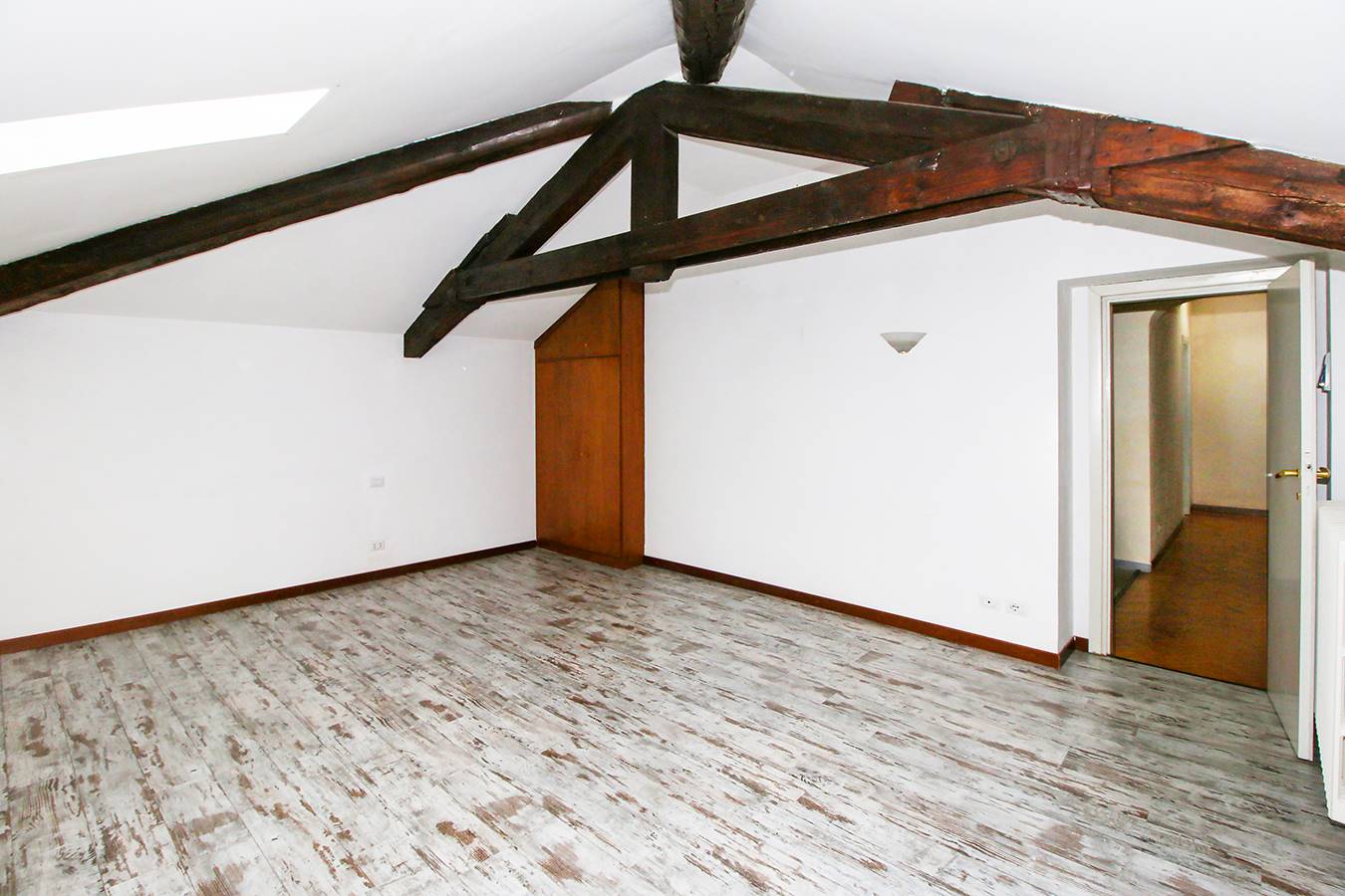 Each apartment is spread over four levels: in the basement garage, cellar and laundry room; on the ground floor living room, kitchen, guest bathroom; on the first floor three bedrooms and two bathrooms; on the second floor two attic bedrooms with exposed beams and a bathroom with shower.