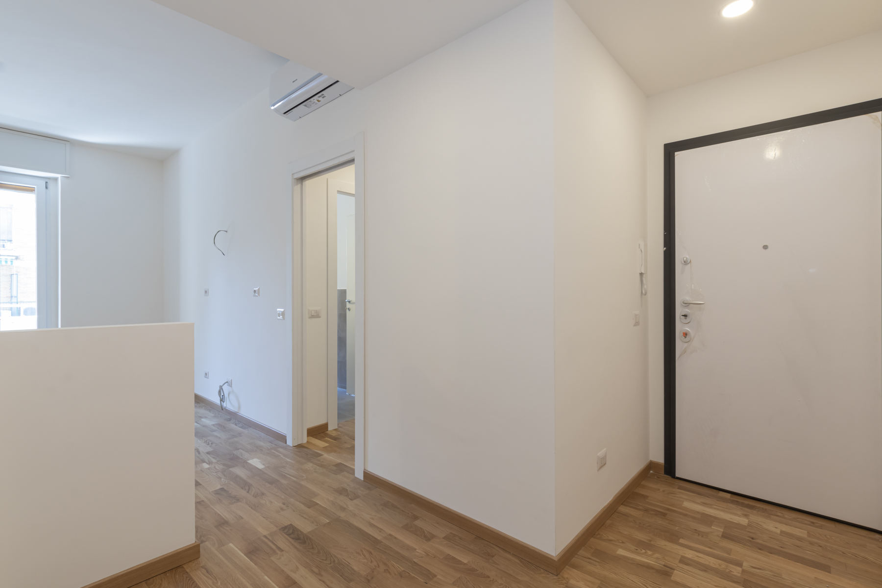 Si accede all’appartamento tramite due porte blindate ed una bussola di proprietà esclusiva e comune solo con l’appartamento attiguo. E’ un bilocale composto da: