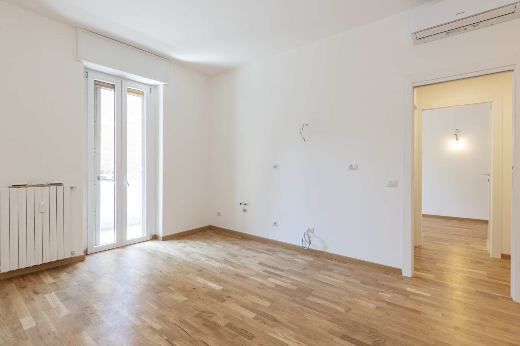 Ingresso su area living e cucina a vista con porta finestra (90/245) con accesso diretto al balcone di 8 metri.