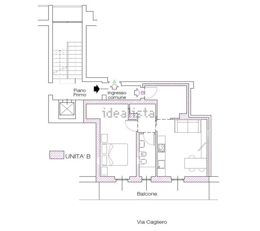 E’ un primo piano alto a 6,91 metri dal suolo e con affaccio sul percorso pedonale e sul giardino. Non ha affaccio diretto sulla strada che dista 15 metri.