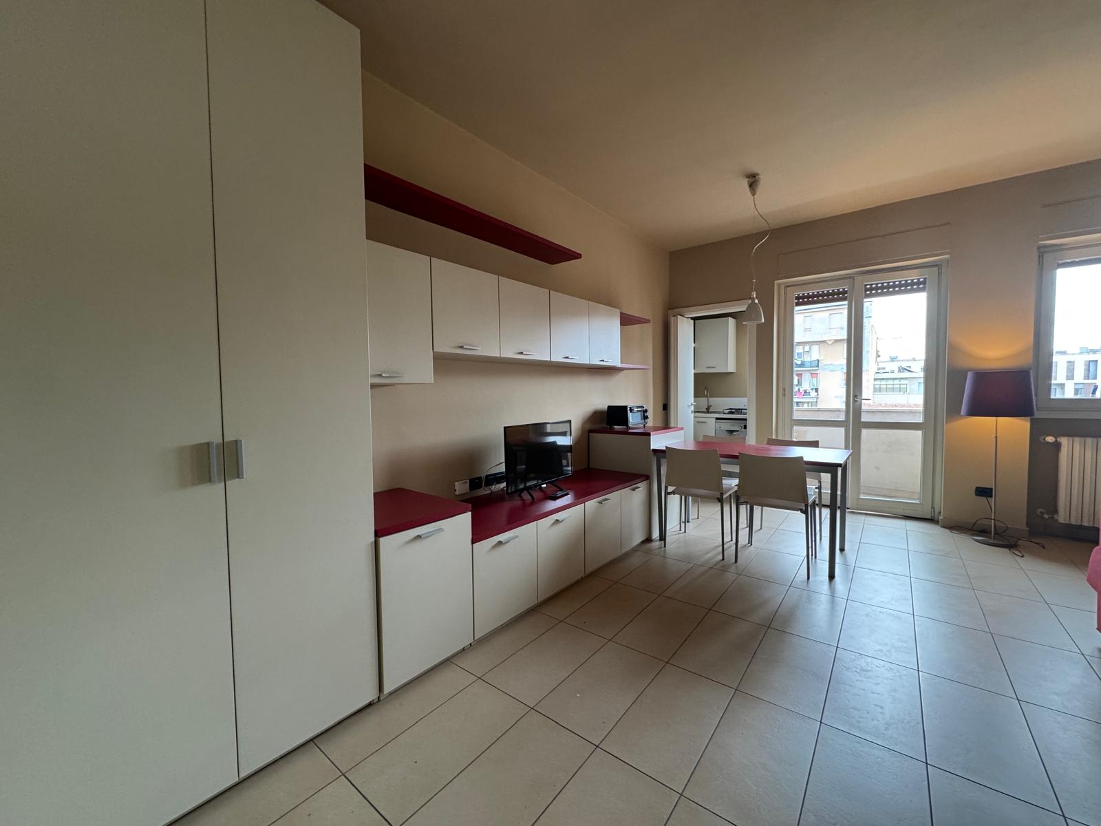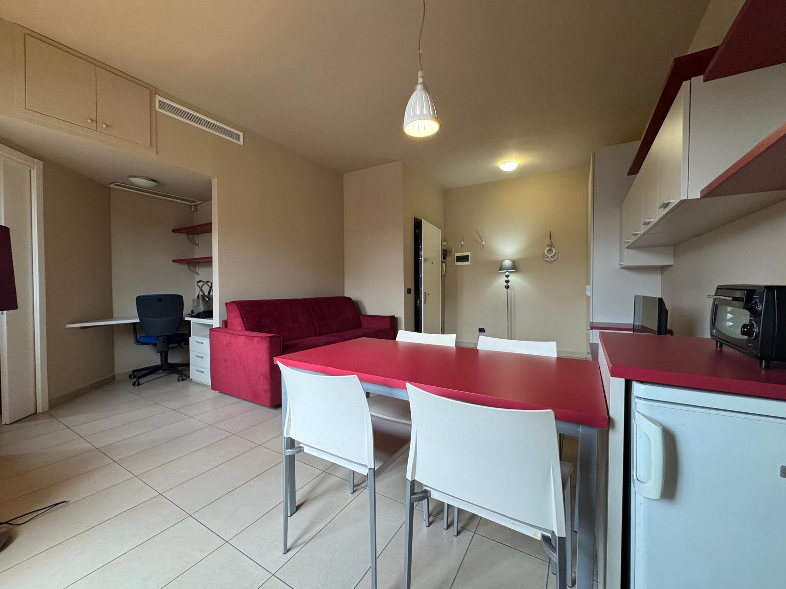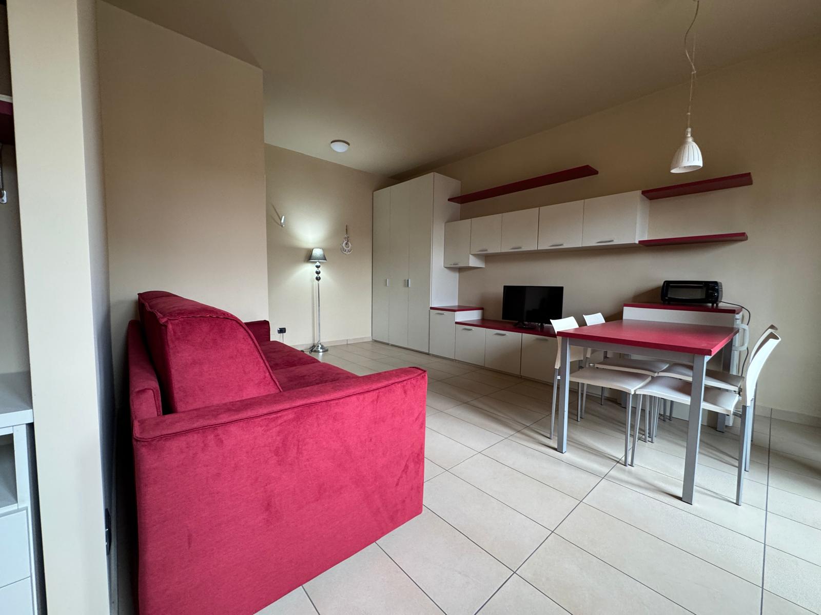 Ingresso, soggiorno notte con armadiature capienti divano letto comodo, un cucinotto con finestra, balcone, zona studio e un bel bagno con due finestre e box doccia.